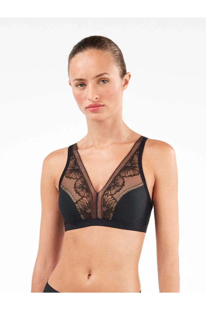 A nyakkivágásnál és a pántoknál finom virágos csipke részletek találhatók, amelyek nőies és elegáns megjelenést kölcsönöznek.